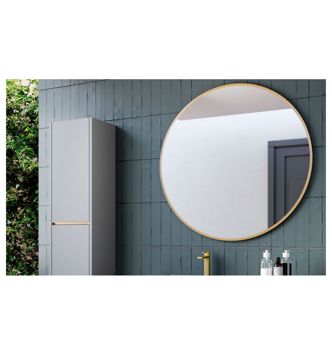 Espejo con forma redonda y borde serigrafiado sobre el cristal en color oro.
