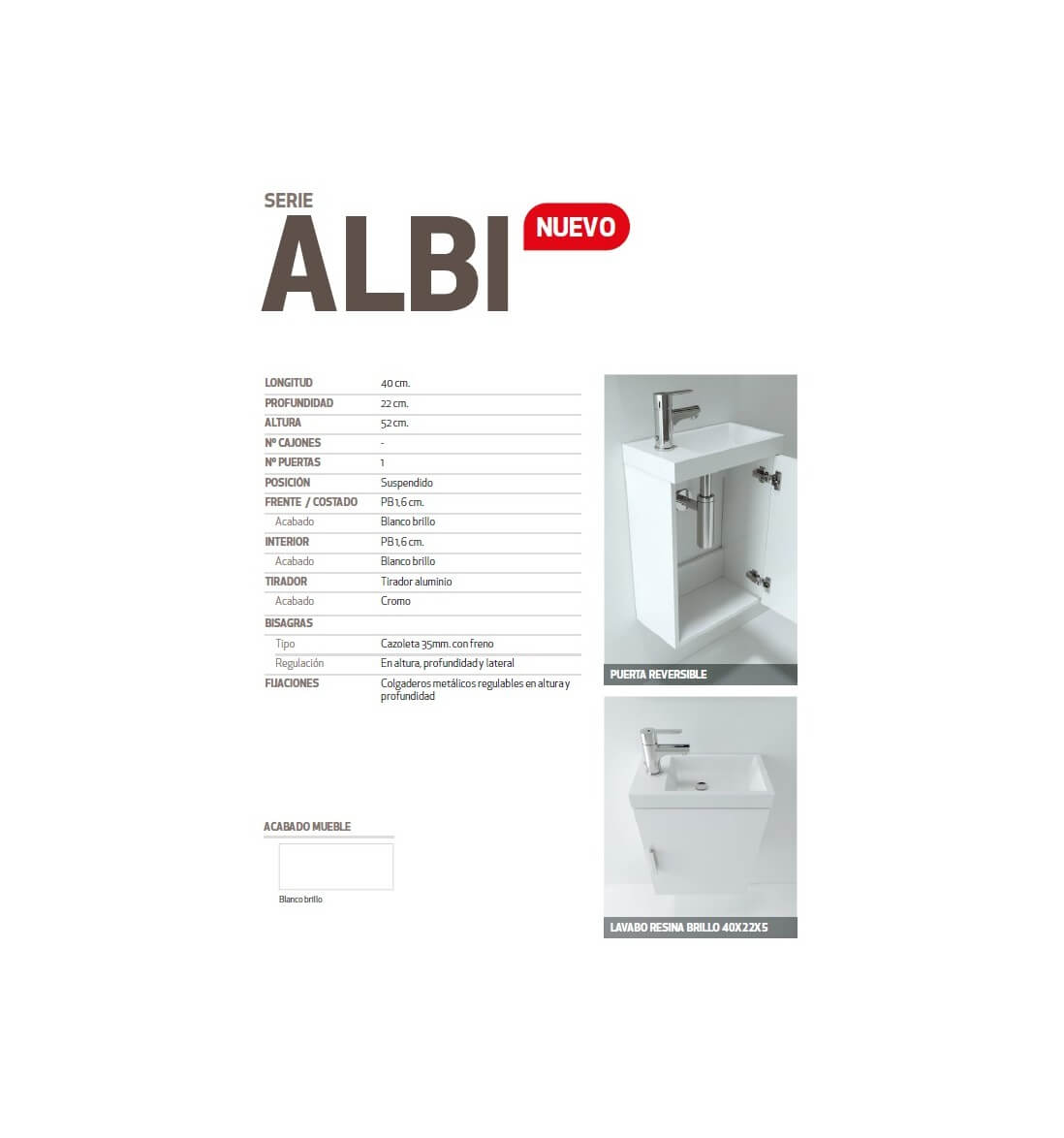 Consta de 1 puerta (reversible). Tirador de aluminio cromo. Bisagras tipo cazoleta 35mm con freno. Regulación en altura, profundidad y lateral. Fijaciones con colgaderos metálicos regulables en altura y profundidad.