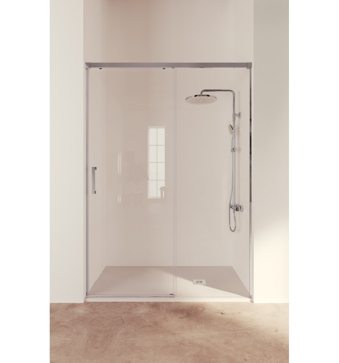 Mampara de ducha minimalista y muy actual compuesta por un cristal fijo y puerta corredera transparente. Vidrio templado transparente de 6mm de grosor. Cruce de puerta: máx. 6 cm. Guía inferior metálica extraíble para facilitar la limpieza de la totalidad del vidrio. Acabado aluminio cromo. Tirador latón cromado. Tratamiento antical incluido.