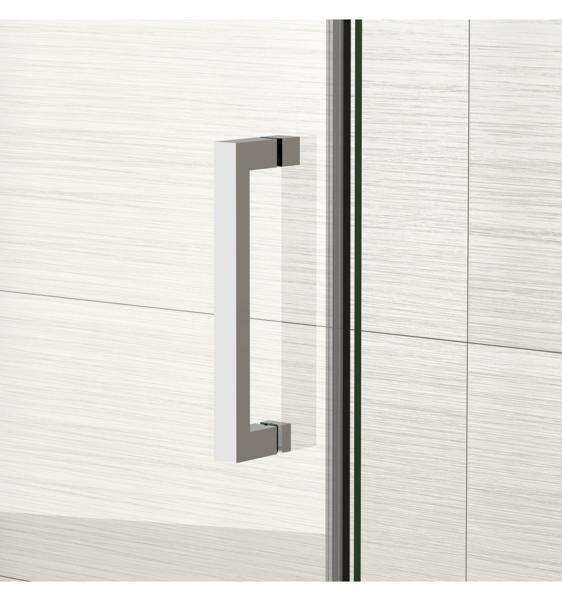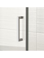 Esta mampara de ducha frontal dispone de 1 panel fijo + 1 corredera, perfilería en aluminio cromo, cristal transparente templado de 6 mm, con tratamiento antical y tirador de latón cromado.