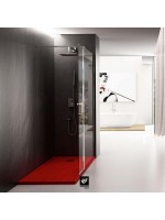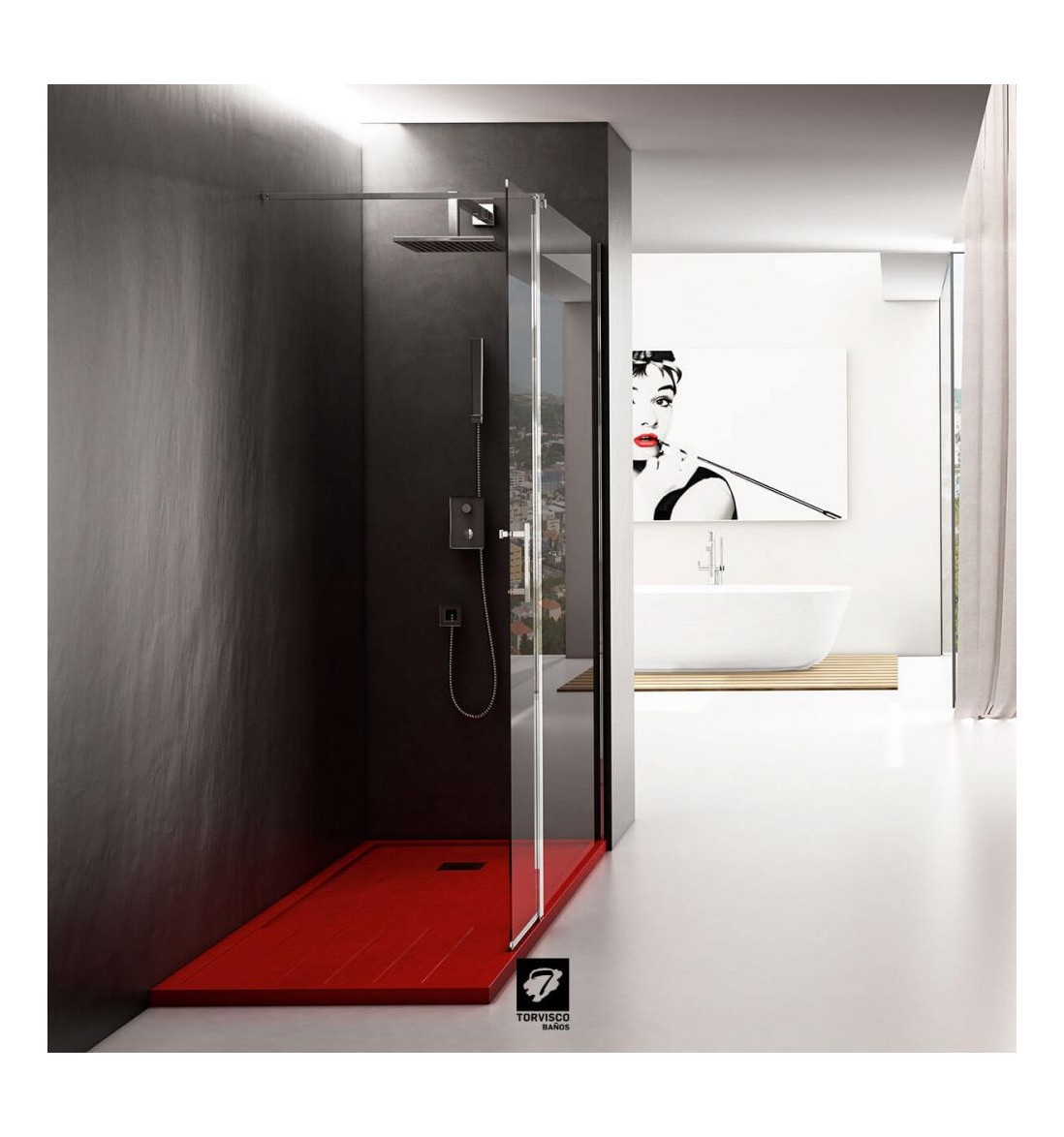 Este panel fijo + abatible de ducha dispone de cristal transparente templado de 6 mm con tratamiento antical incluído. Acabado cromo o  negro.